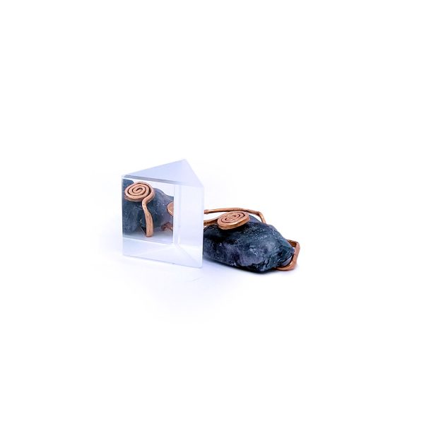 Kamień o solidnej, gładkiej formie został ręcznie osadzony w miedzianej oprawie, która subtelnie otacza jego krawędzie,