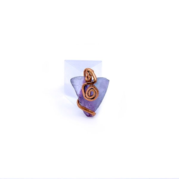 Kamień został ręcznie osadzony w estetycznej miedzianej oprawie, której subtelny design podkreśla geometryczną formę Fluorytu.