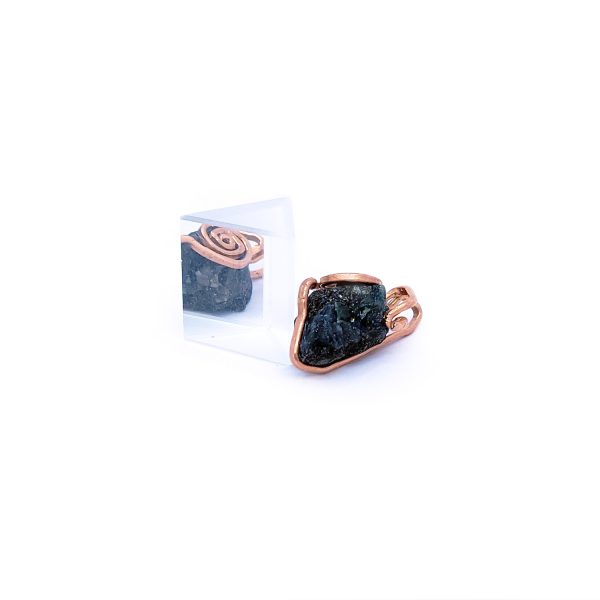 Miedziana oprawa w formie dużej spirali z przodu nie tylko zabezpiecza kamień, ale także podkreśla jego naturalne piękno i unikalność.